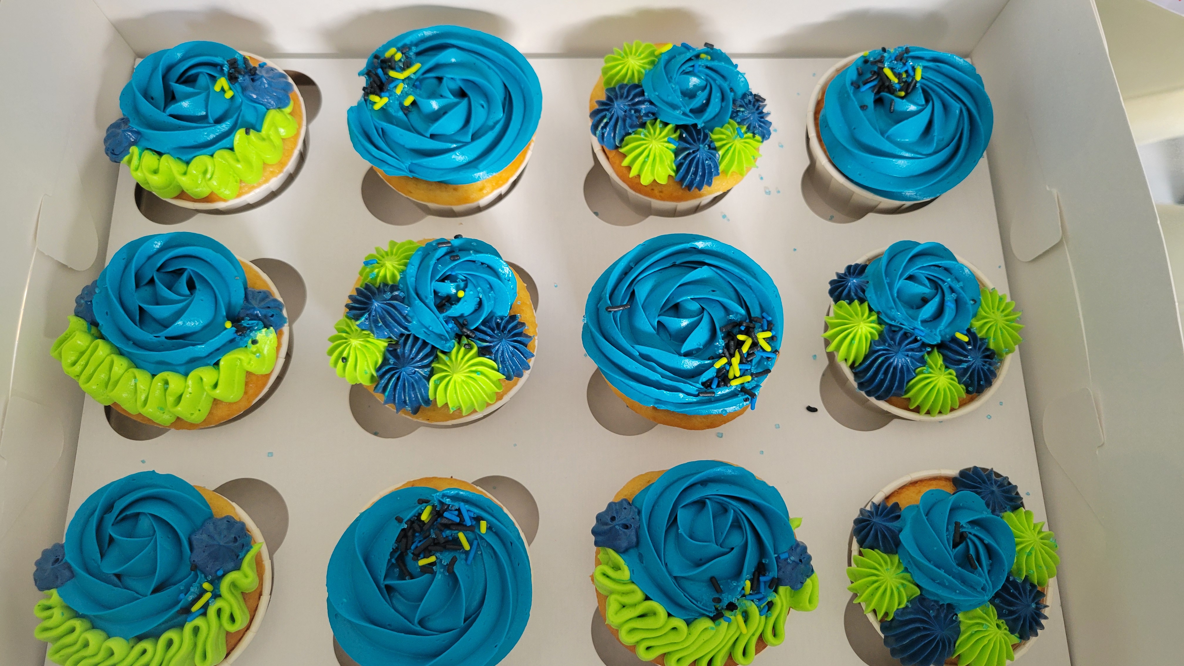 This Blue & Lime Swirl Celebration Cupcakes was made fresh to order in Bedford, Nova Scotia. Every design is unique and crafted with care — no two creations are exactly alike.